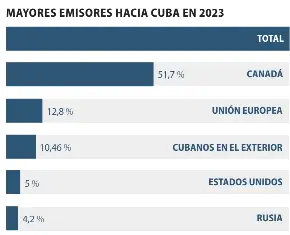 Canadá, los cubanos residentes en el exterior (51 187) y Estados Unidos (24 451) son los tres destinos de origen que representan el 67,2% del total acumulado de las llegadas de visitantes internacionales, lo que se corresponde con la mayor representatividad de la contingencia aérea.