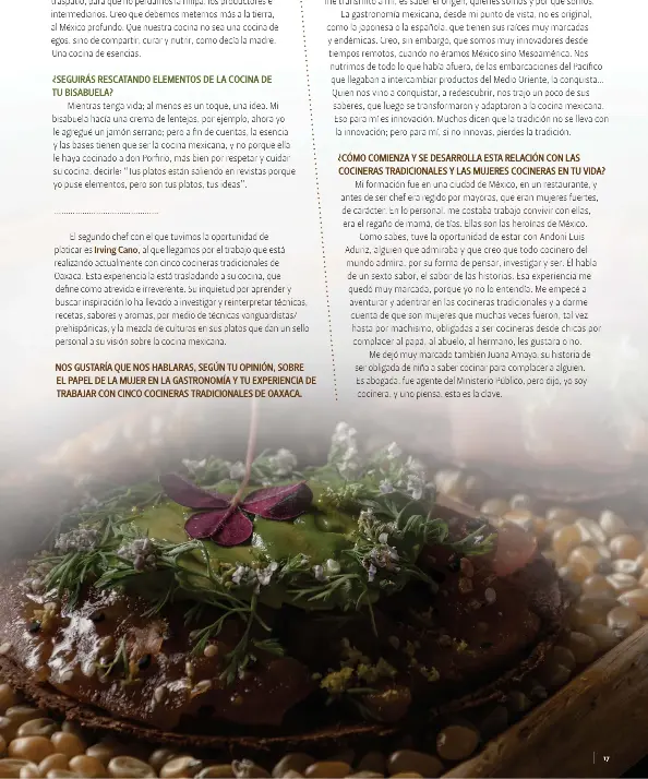 resistencia, cocinar con esos productos también lo es. Hagamos resistencia para que no perdamos el producto de traspatio, para que no perdamos la milpa, los productores e intermediarios. Creo que debemos meternos más a la tierra, al México profundo. Que nuestra cocina no sea una cocina de egos, sino de compartir, curar y nutrir, como decía la madre. Una cocina de esencias.