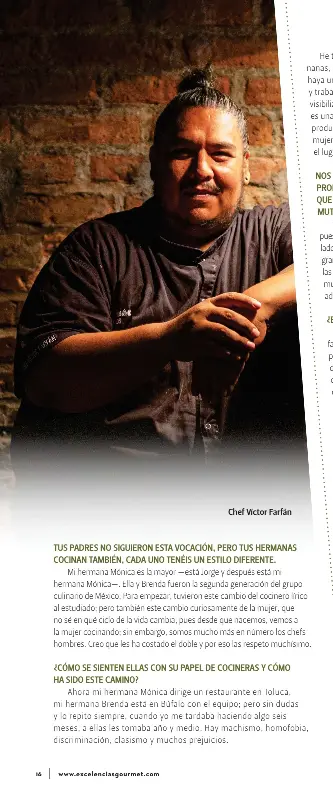 He tratado, después de tener mi experiencia gastronómica con nanas, mi bisabuela, mis hermanas, de que en todas mis cocinas haya una mujer como chef operativo. Son mucho más ordenadas y trabajadoras, es impresionante. Es muy chistoso que el que se visibiliza es el chef tatuado, el chef artístico, y la que hace la chamba es una niña que pesa 50 kilos, que tiene 20 años y que hizo toda tu producción. Hay que darle el valor a nuestro personal y más a las mujeres; hay que hacerlas grandes, que ya lo son, es más bien darles el lugar que se merecen. Mi hermana Mónica es la mayor —está Jorge y después está mi hermana Mónica—. Ella y Brenda fueron la segunda generación del grupo culinario de México. Para empezar, tuvieron este cambio del cocinero lírico al estudiado; pero también este cambio curiosamente de la mujer, que no sé en qué ciclo de la vida cambia, pues desde que nacemos, vemos a la mujer cocinando; sin embargo, somos mucho más en número los chefs hombres. Creo que les ha costado el doble y por eso las respeto muchísimo.